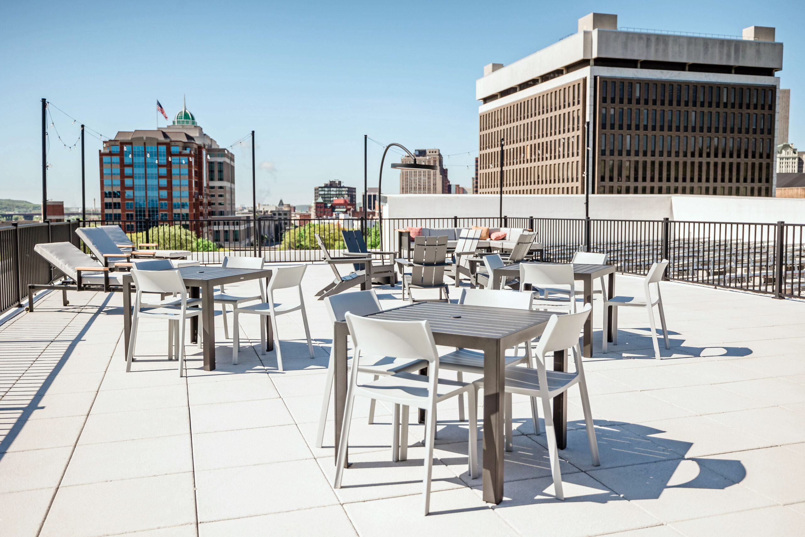 Industrie, uno sviluppo residenziale multifamiliare a zero emissioni realizzato da The Rosenblum Companies, sta ridefinendo la vita urbana ad Albany, NY. I servizi dell’edificio Industrie integrano perfettamente sostenibilità e comfort per i residenti, tra cui un’ampia terrazza panoramica. Questo spazio all’aperto funge da punto di incontro sociale, offrendo una vista panoramica sullo skyline del centro di Albany e sul fiume Hudson, in linea con la missione ecologica dell’azienda. Per estendere l’utilizzo di questa area esterna nei mesi e nelle serate più fresche senza ricorrere al riscaldamento a combustione, Rosenblum ha scelto il riscaldatore portatile Eclipse di Bromic.