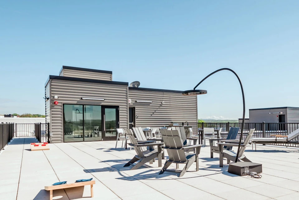 La terrazza sul tetto di Industrie è uno spazio di ritrovo molto ambito, perfetto per qualsiasi cosa, dai tornei di cornhole alle cene intime al tramonto. Tuttavia, essendo un edificio completamente elettrico, i tradizionali bracieri e riscaldatori a gas non erano un’opzione. The Rosenblum Companies aveva bisogno di una soluzione che offrisse calore e atmosfera senza l’uso di combustibili fossili.