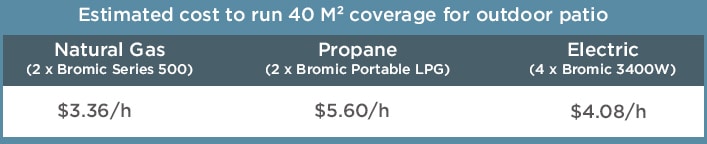 I costi di funzionamento variano a seconda del modello e della potenza (in watt per l’elettricità e BTU per il gas). In generale, il gas naturale è il modo più economico per riscaldare un ponte, seguito dall’elettricità e dal propano. Qui sotto c’è una stima del costo del riscaldamento di un ponte di 200 piedi quadrati con la gamma di riscaldatori Bromic.